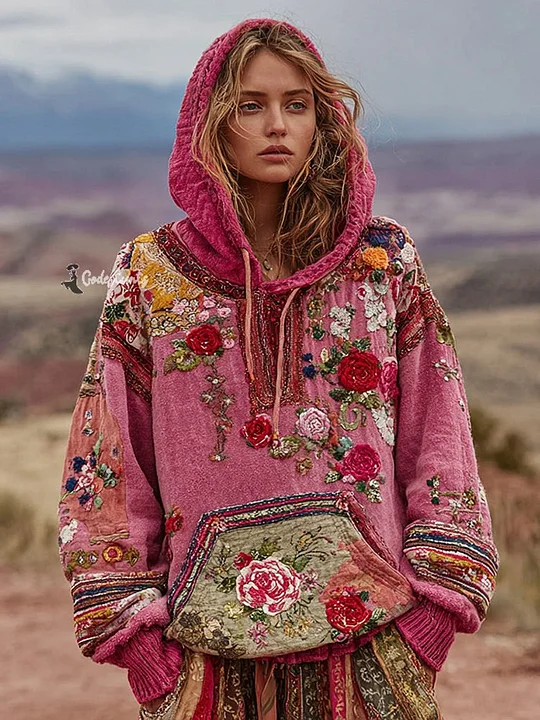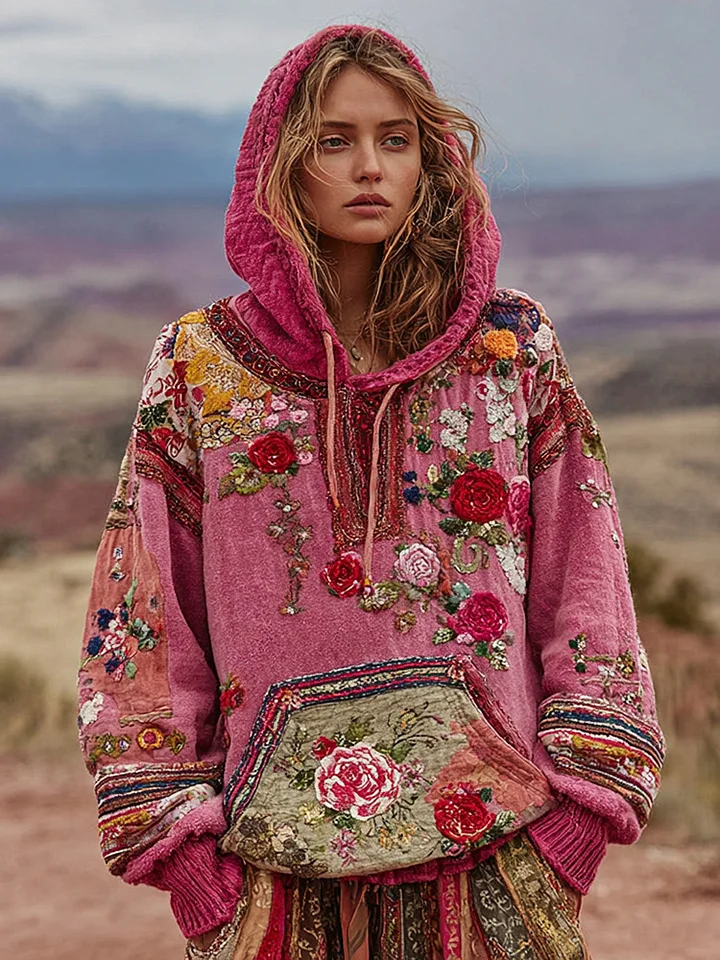 Bohemian Style Three-dimensional Flower Embroidery Pink Patchwork Hooded Long-sleeved Sweater