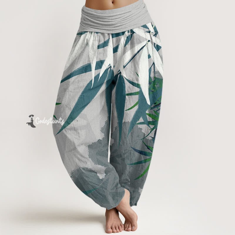 Design: The harem pants feature a bold and abstract bamboo design, with flowing lines and natural shapes that evoke a sense of movement and tranquility. The intricate bamboo leaves are scattered across the fabric, creating a harmonious and calming effect. This unique pattern brings an artistic and organic touch to the pants, making them a standout piece in any wardrobe.