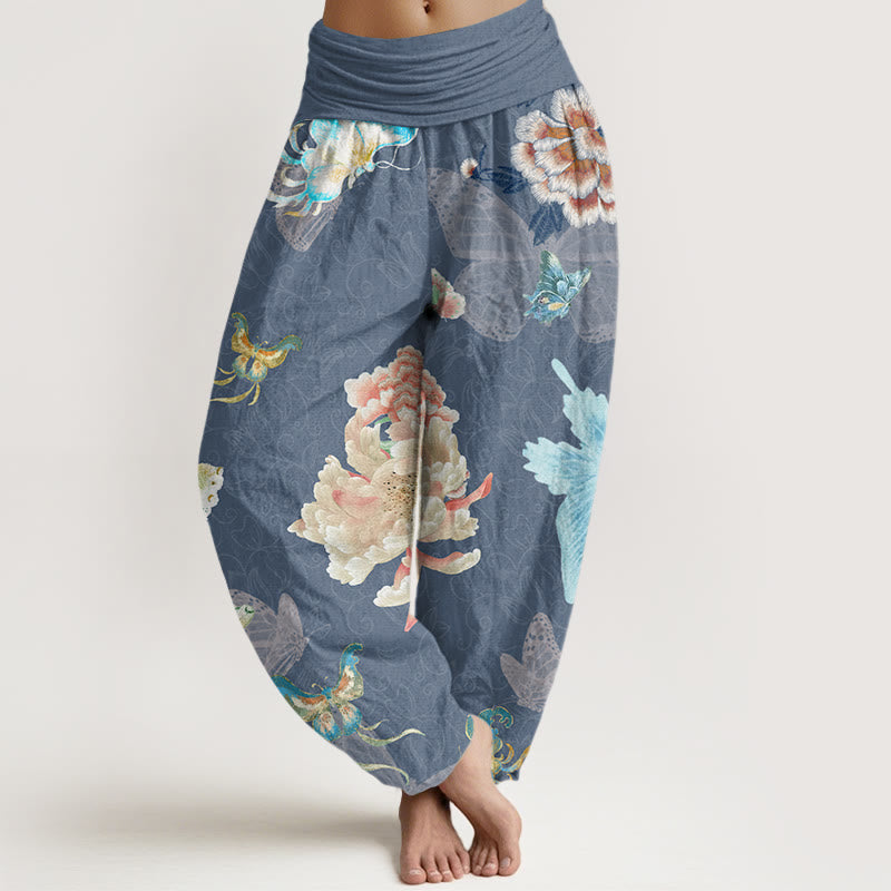 Design: The harem pants featuring chrysanthemums and butterflies symbolize beauty, transformation, and the cycle of life. Chrysanthemums represent longevity and renewal, while butterflies signify change and freedom, together encouraging wearers to embrace the beauty of growth and the fleeting moments of life.