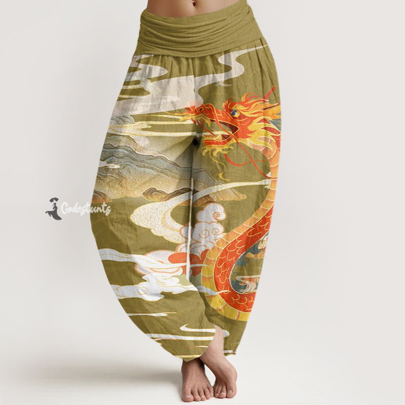 Design: The harem pants featuring dragons and auspicious clouds symbolize power, strength, and good fortune. In Chinese culture, dragons represent mastery and protection, while the clouds signify luck and the promise of abundance, together encouraging wearers to embrace their inner strength and the positive energies of life.