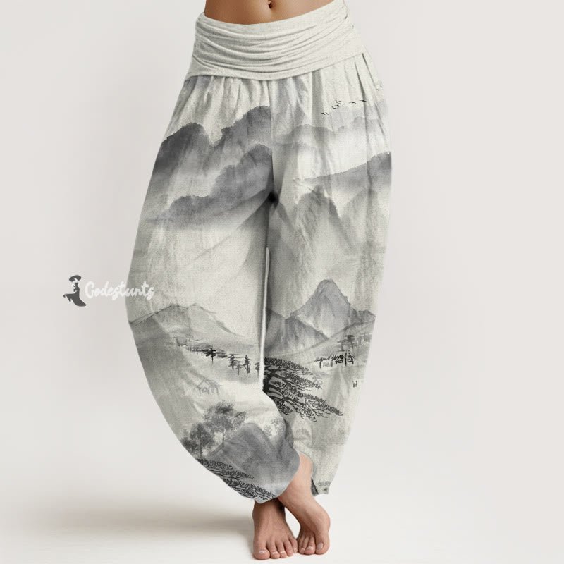 Landscape Ink Painting Harem Pants feature a tranquil design inspired by nature, depicting mountains and trees in elegant ink painting style. Made from breathable fabric, these pants offer comfort and flexibility. The elastic waistband provides a secure fit while maintaining ease of movement. Ideal for those seeking a deep connection with nature and mindfulness, they promote peace and serenity in everyday life.💕