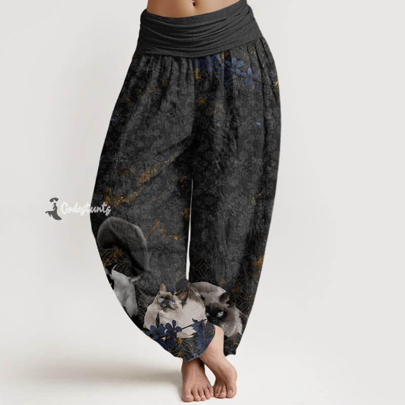 Design: The harem pants featuring Siamese cats, coin patterns, and flowers symbolize prosperity, companionship, and the beauty of life. The Siamese cat represents loyalty and elegance, while the coins signify wealth and good fortune; together with the floral elements, they encourage wearers to embrace joy, abundance, and the cherished connections in their lives.
