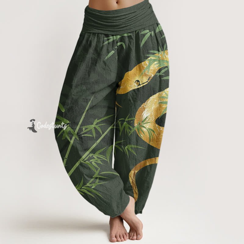 Design: The harem pants featuring snakes and bamboo designs symbolize transformation, resilience, and strength. The snake represents renewal and the shedding of old identities, while bamboo signifies flexibility and integrity, encouraging wearers to embrace change and maintain balance in their lives.