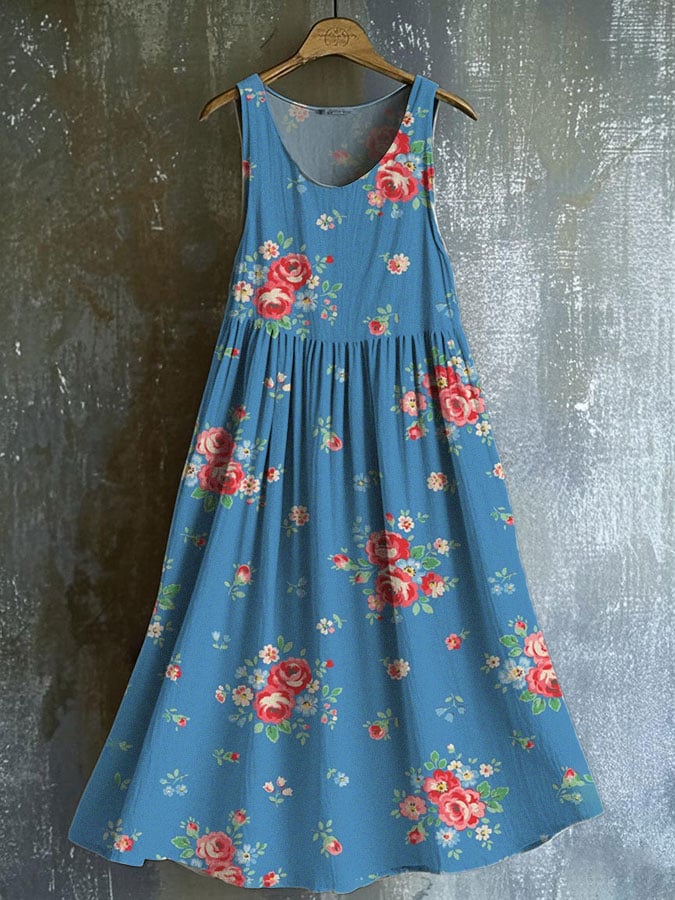 Cotton and linen woven retro pastoral style literary small floral suspender dress