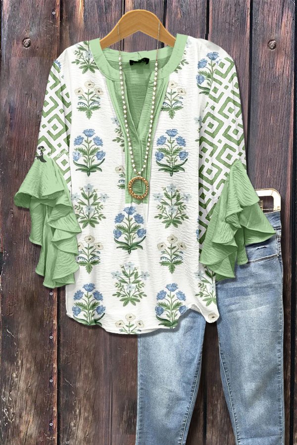 Flroal Print Geo Ruffle Sleeve Top