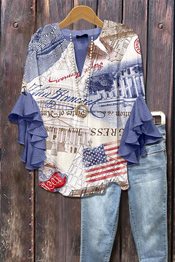 Mixed American Flag Print Ruffle Sleeve Patriotic Top