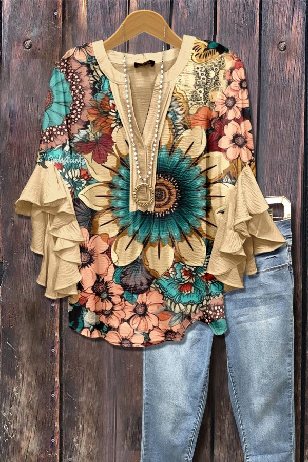 Multi Floral Print Ruffle Sleeve Top