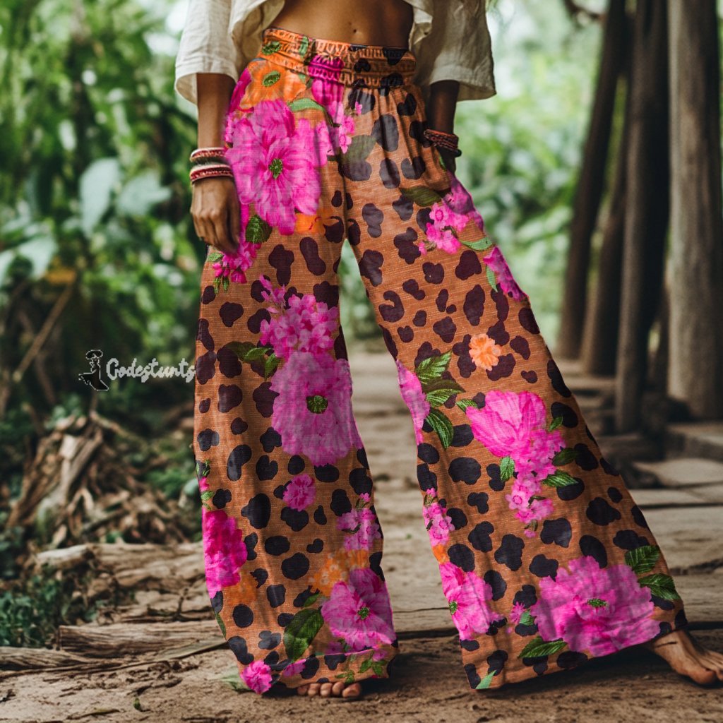 Vintage Floral Leopard Print Loose Wide-leg Pants