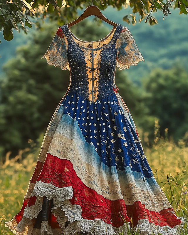 Summer Independence Day Embroidered Lace Patchwork Dress bf3a