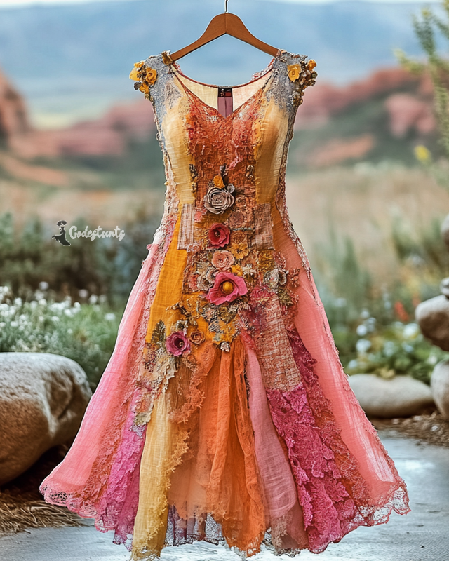 Summer Vintage Floral Lace Patchwork Dress e534