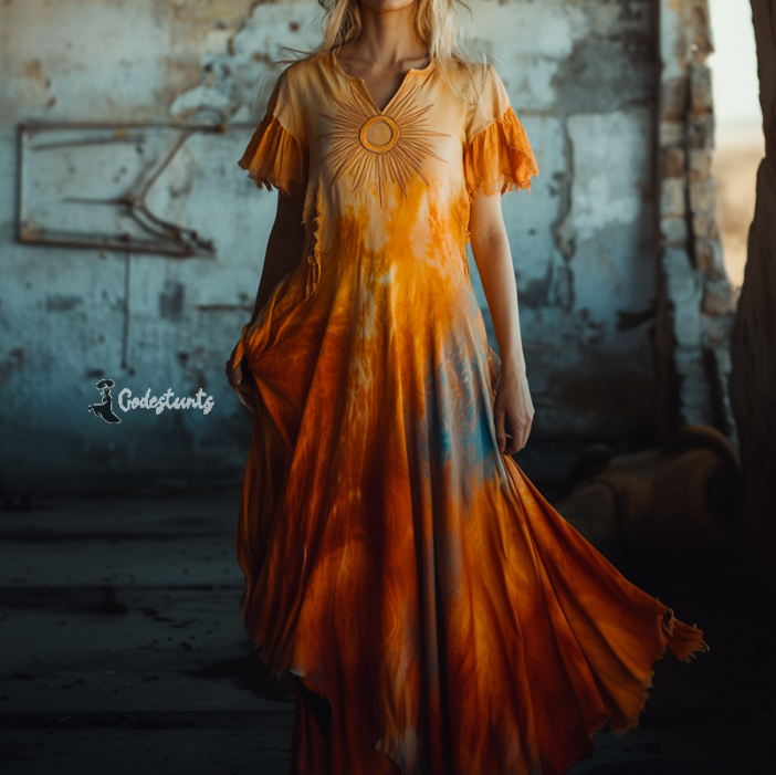 Tie-dye gradient star and moon embroidery retro casual dress 2810