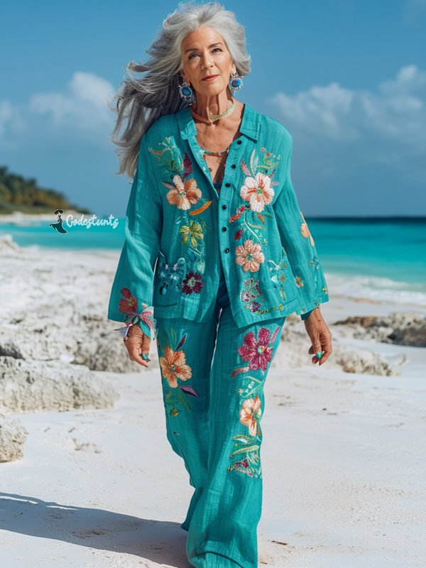Vacation seaside elegant embroidery top + pant two piece set 396c