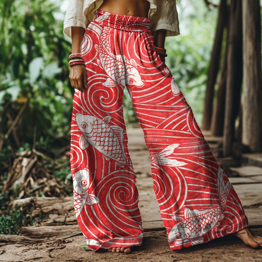 Vintage Fish Art Print Loose Wide-leg Pants