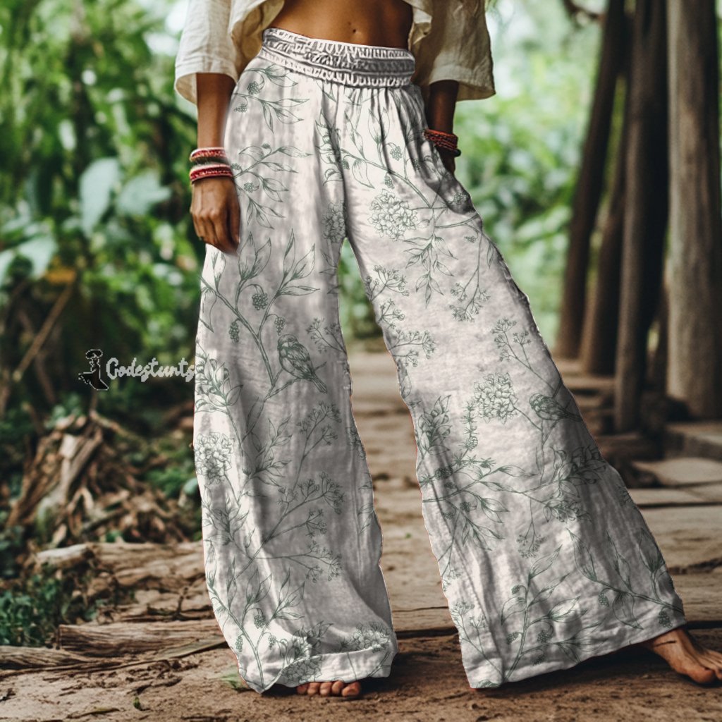 Vintage Floral and Bird Print Loose Wide-leg Pants