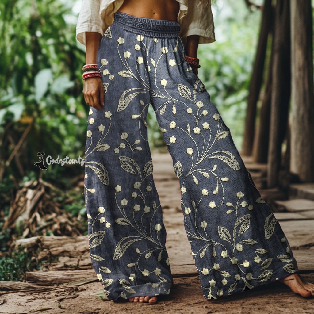 Vintage Floral Embroidery Print Loose Wide-leg Pants