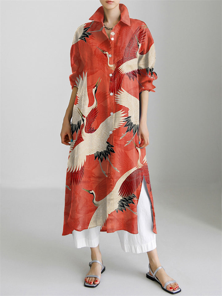 Vintage Flying Crane Art Pattern Long Sleeve Slit Shirt Dress