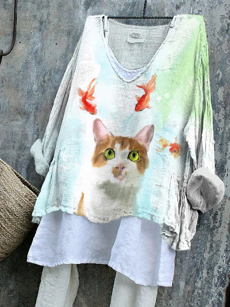 Vintage Goldfish and Cat Print Cozy Flowy Tunic