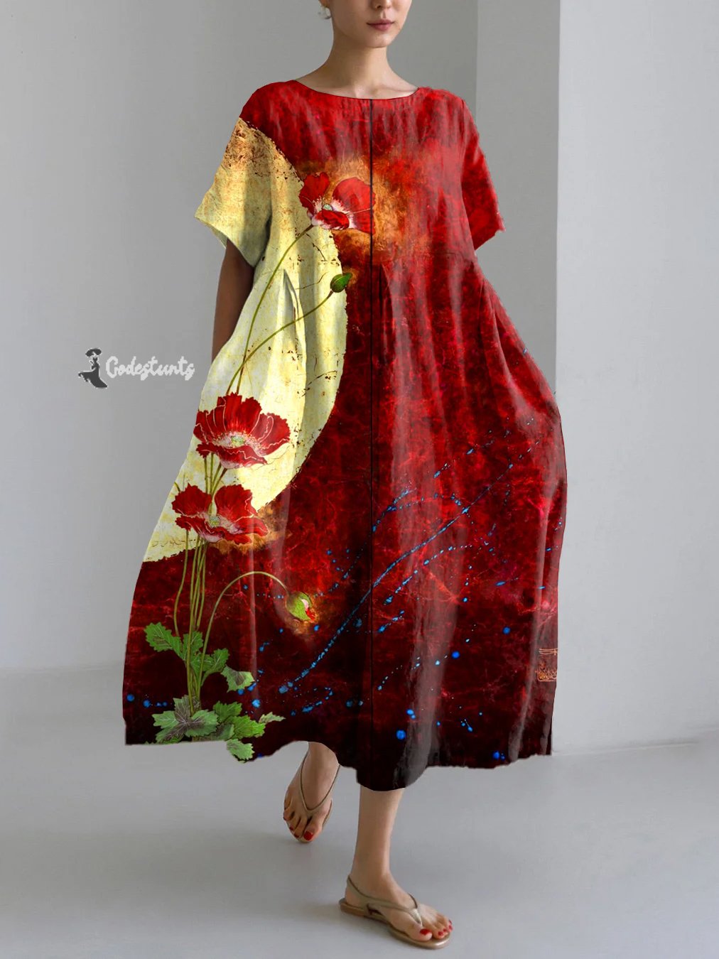 Vintage Japanese Art Flower And Moon Print Linen Blend Maxi Dress