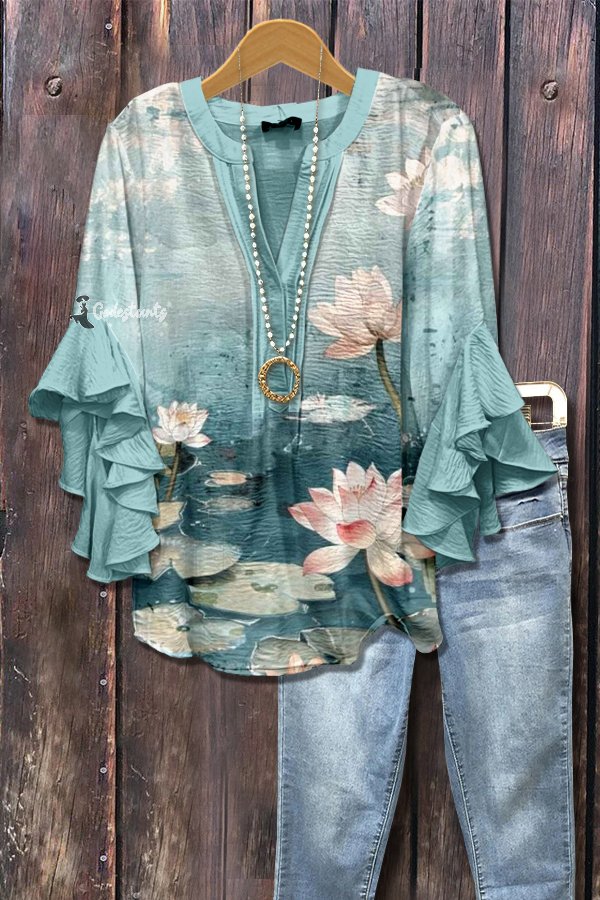 Vintage Lotus Print Ruffle Sleeve Top