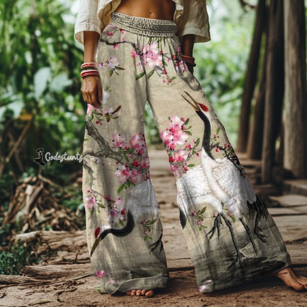 Vintage Plum Blossom and Crane Art Print Loose Pants