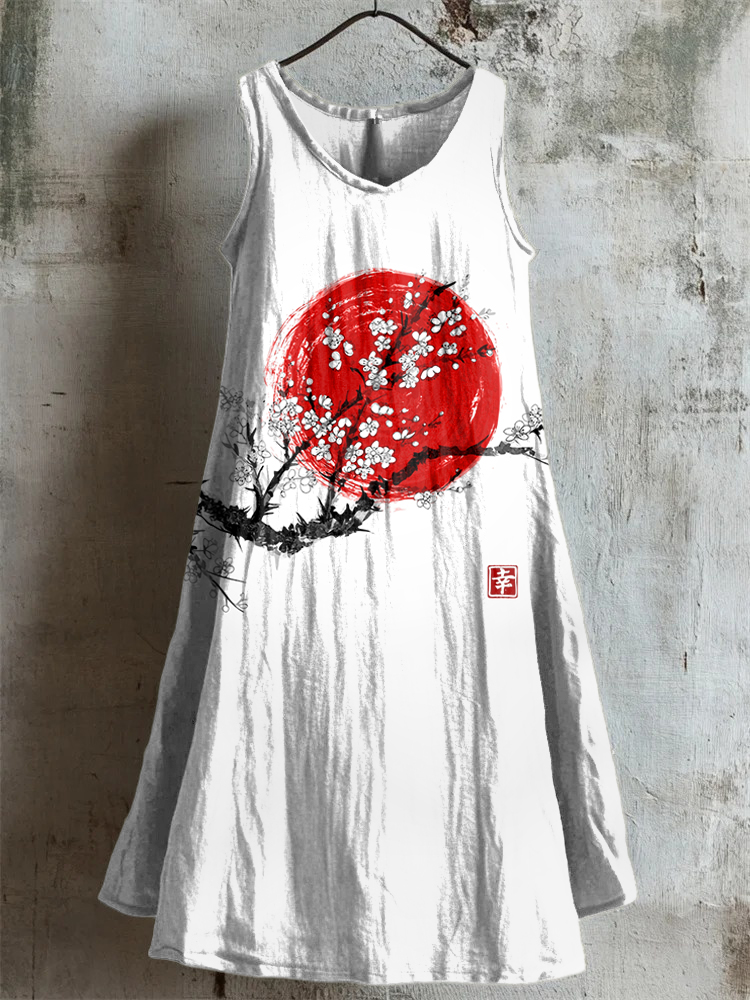 Vintage Sunrise Japanese Art Print Linen Tank Dress