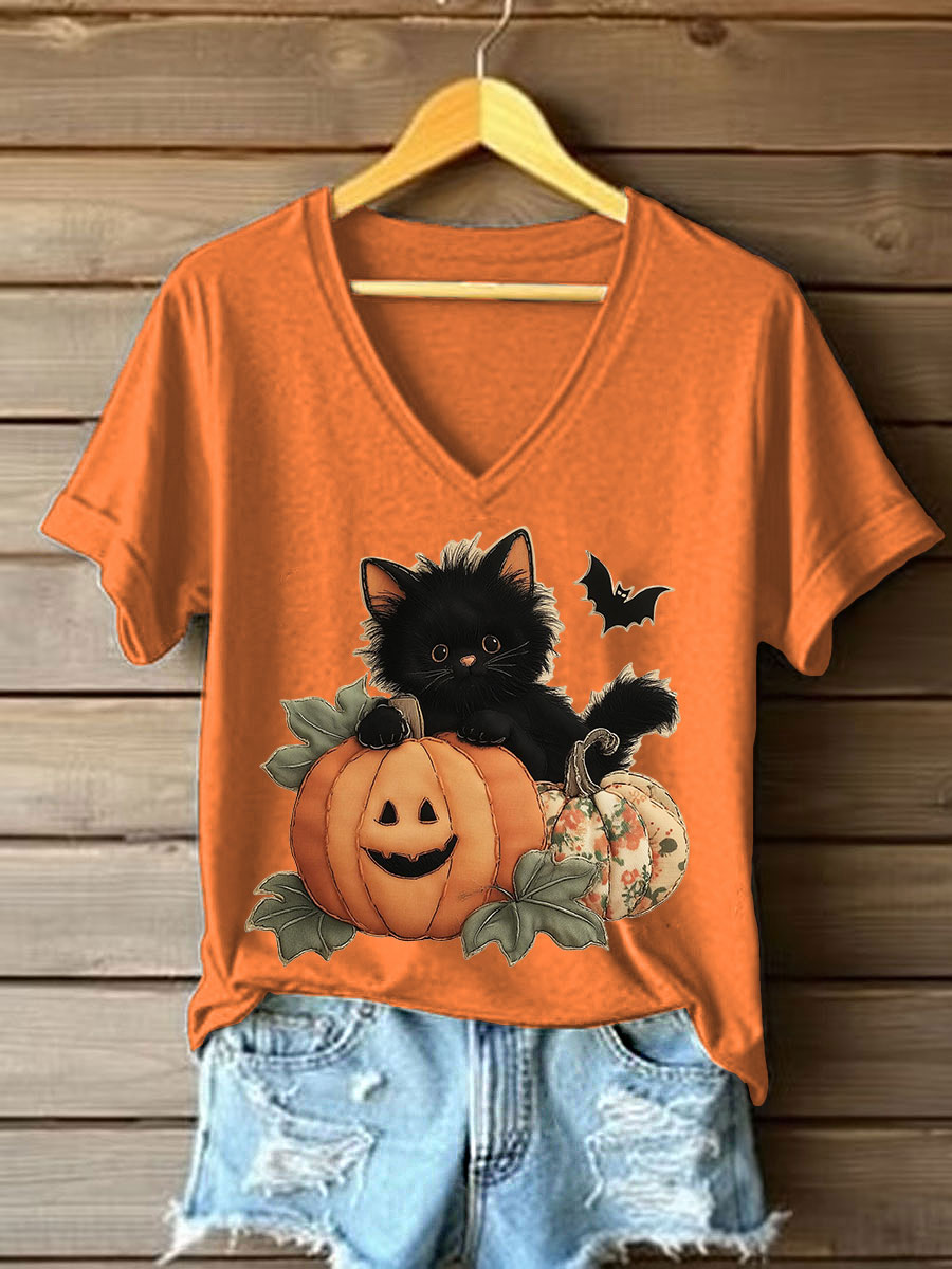 Women's Black Kitten Pumpkin Patchwork Printed Casual T-Shirt