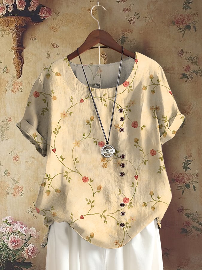 Women's Casual Cotton And Linen Floral Short-Sleeved Round Neck Shirt