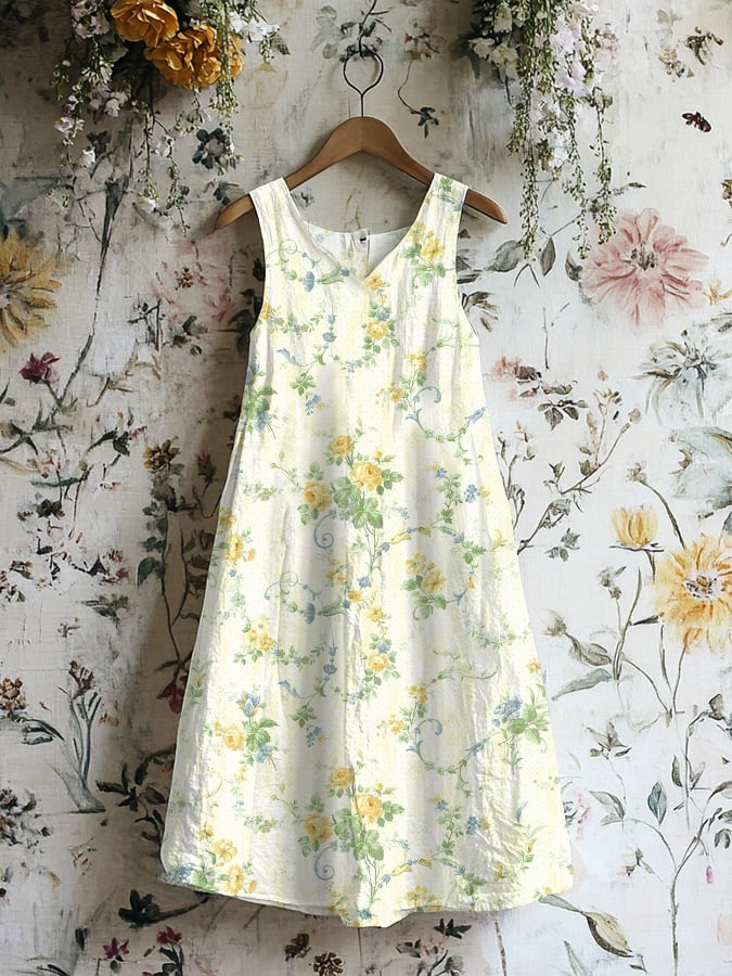 Women's Casual Cotton and Linen Floral Vintage Vest Dress