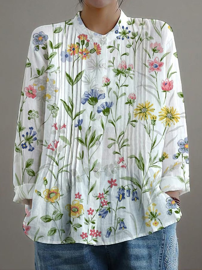 Women's Casual Loose Floral Cotton And Linen Shirt