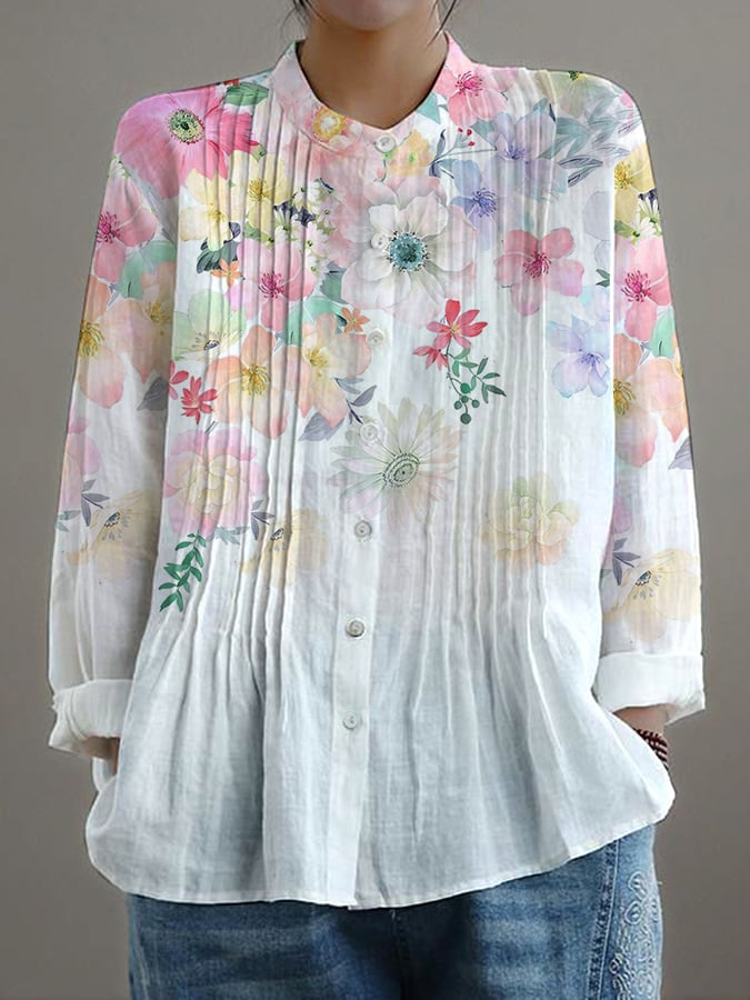 Women's Casual Loose Floral Cotton And Linen Shirt