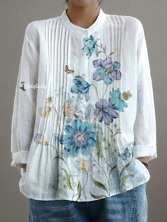 Women's Casual Loose Floral Cotton And Linen Shirt