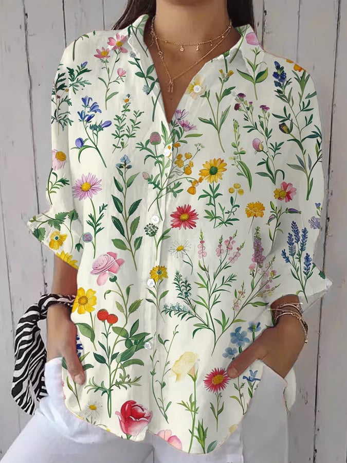 Women's Casual Loose Floral Cotton And Linen Shirt