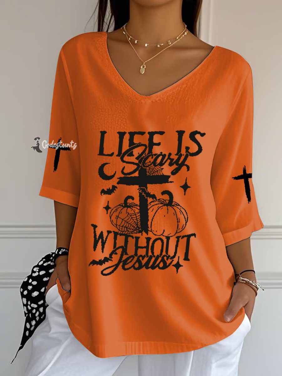 Women's Christian Halloween Life Is Scary Without Jesus Cross Printed V-Neck Top