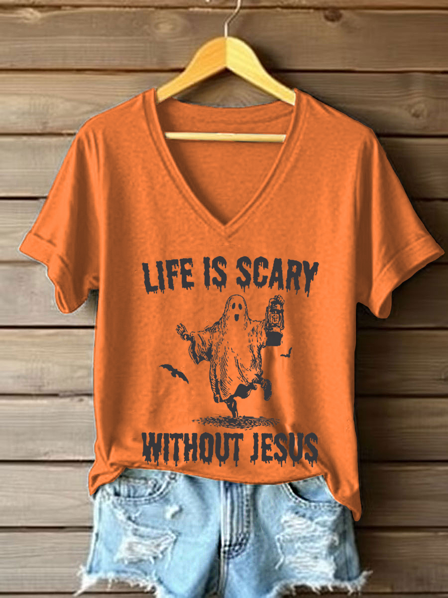 Women's Christian Halloween Life Is Scary Without Jesus Cross Short Sleeve T-Shirt