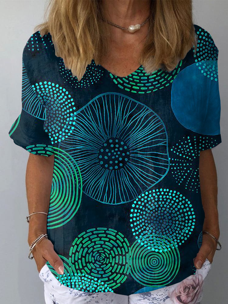 Women's Circle Abstract Art Print Casual V-Neck Cotton And Linen Top