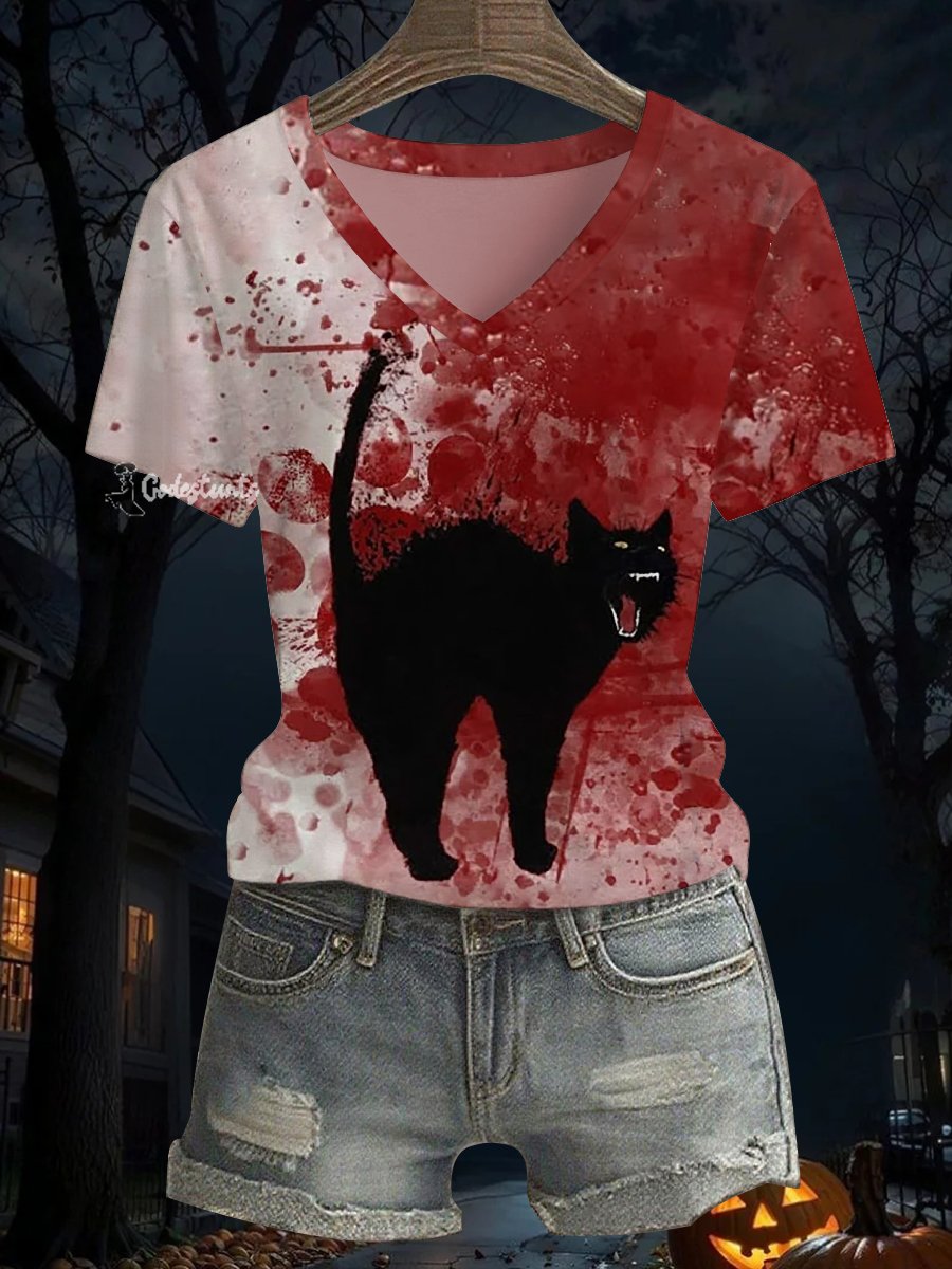 Women's Funny Halloween Blood stain Black Cat Print Short Sleeve T-shirt
