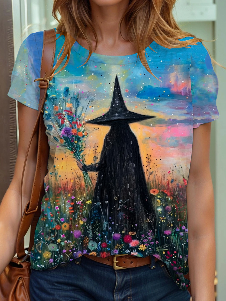 Women's Halloween Beautiful Witches and Wildflowers Print T-shirt
