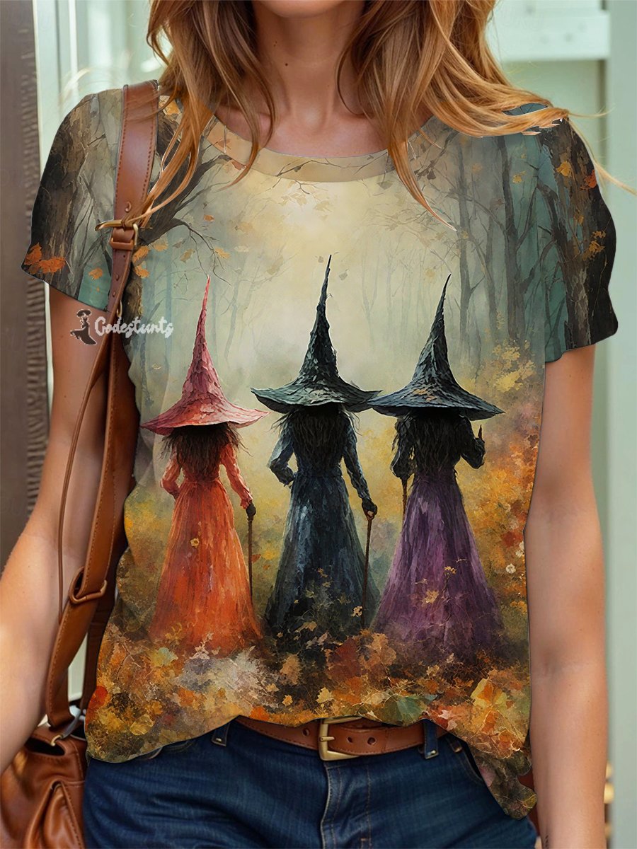 Women's Halloween Beautiful Witches and Wildflowers Print T-shirt