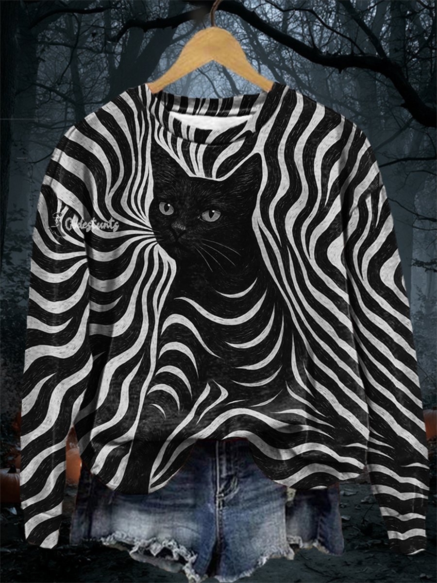 Women's Halloween Black Cat Stripes Print Casual Sweatshirt