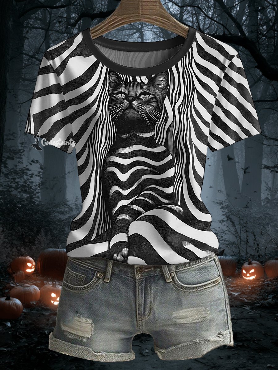 Women's Halloween Black Cat Stripes Print Casual Tee
