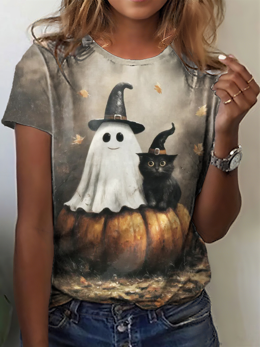 Women's Halloween Cute Ghost and Black Cat in Dark Forest Print T-shirt