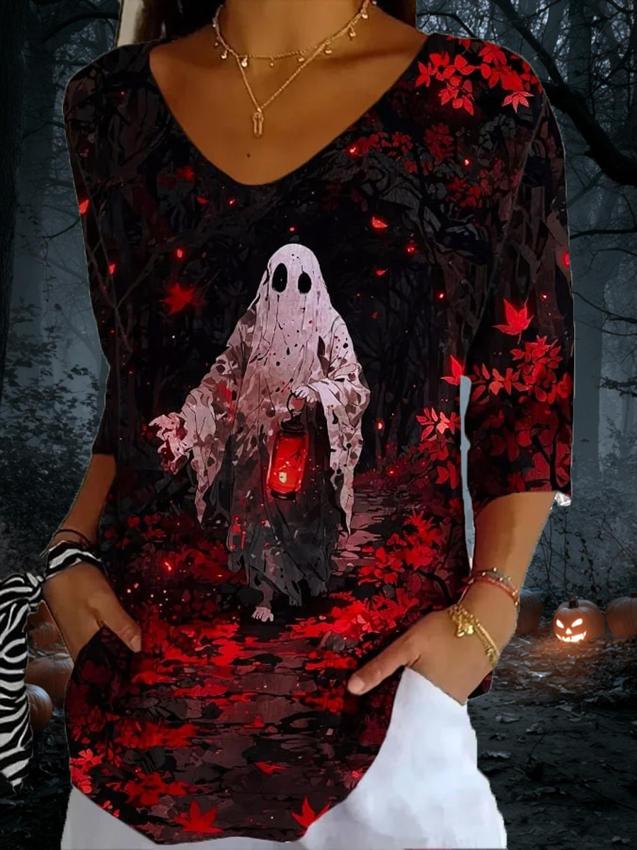 Women'S Halloween Maple Leaf Sheet Ghost Pattern Print V-Neck T-Shirt