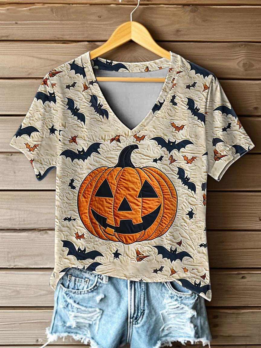 Women's Halloween Pumpkin Printed V-neck T-shirt