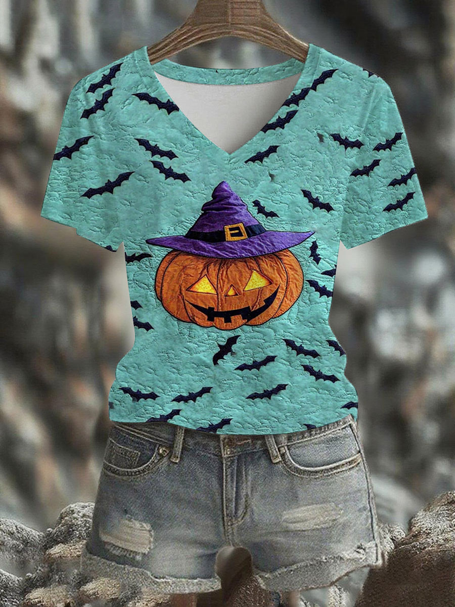 Women's Halloween Pumpkin Printed V-neck T-shirt