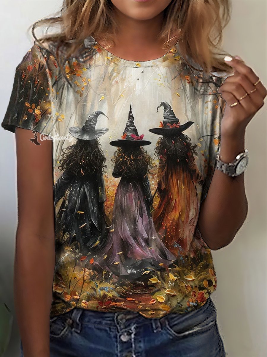 Women's Halloween Three Witches in Vintage Forest Print T-shirt