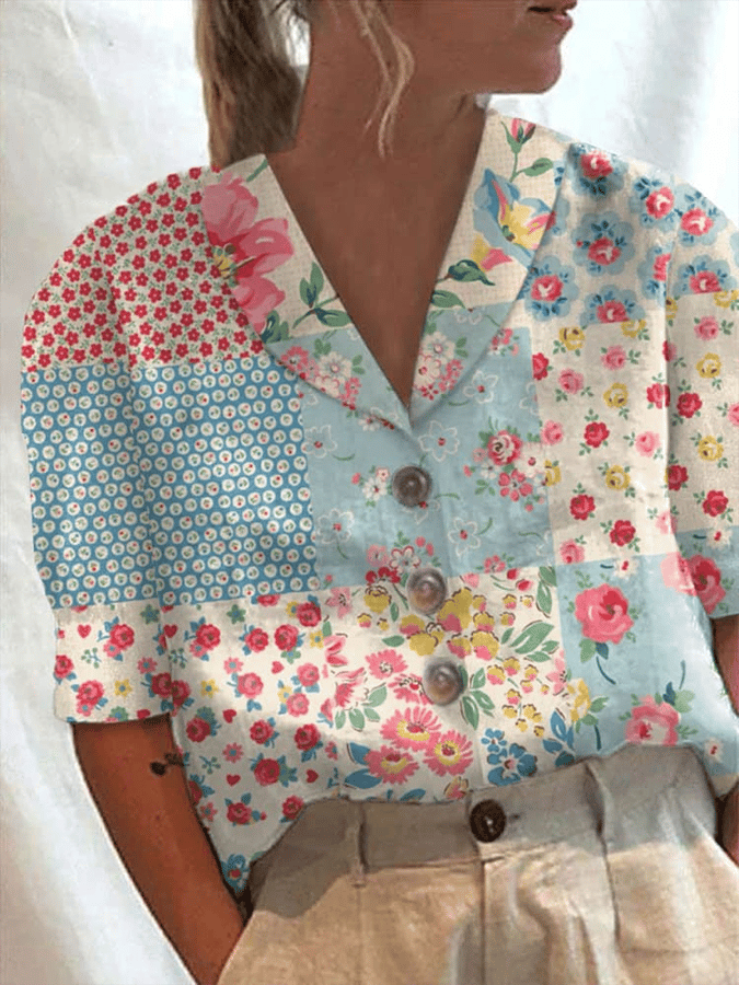 Women's Retro Botanical Floral Patchwork Art Print Design Lapel Button-Down Shirt