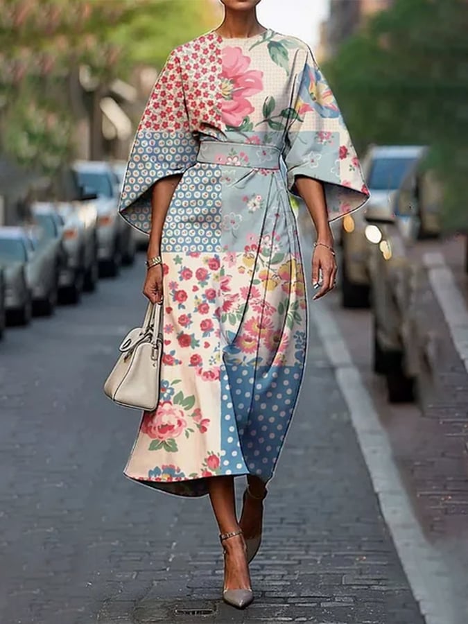 Women's Retro Botanical Floral Patchwork Art Print Dress