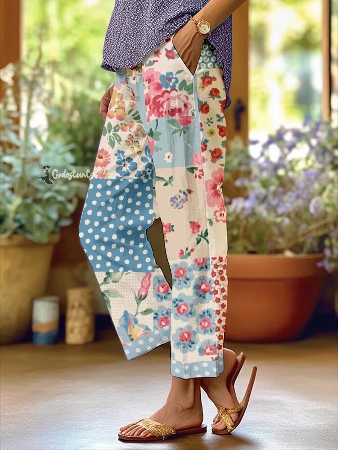 Women's Retro Botanical Floral Patchwork Art Print Loose Pocket Patchwork Casual Pants