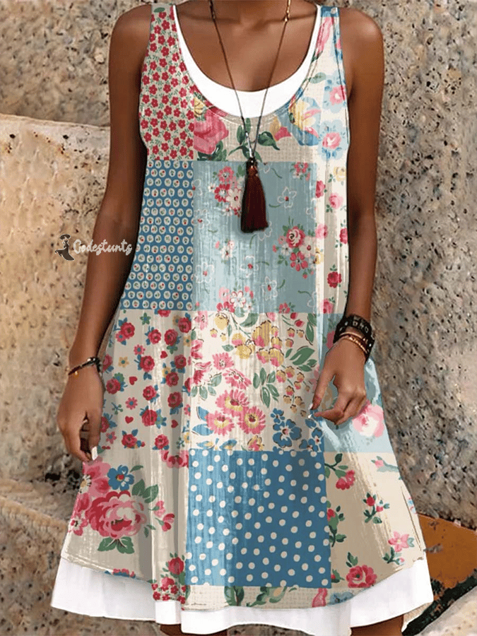 Women's Retro Botanical Floral Patchwork Art Print Sleeveless Casual Dress
