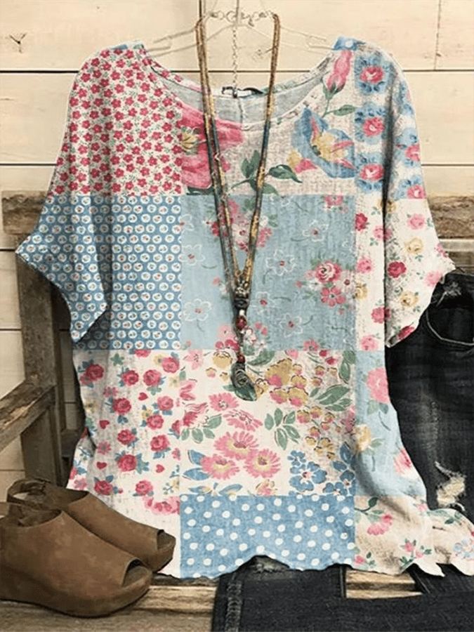 Women's Retro Botanical Floral Splicing Art Print Casual Cotton And Linen Top